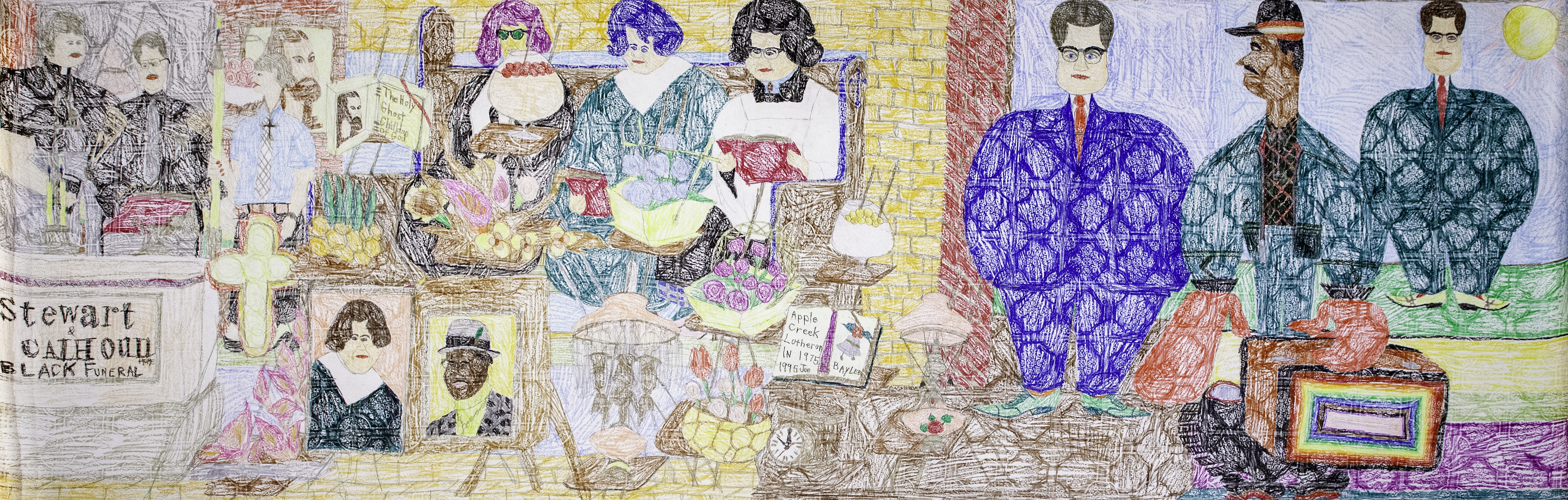 Untitled [Linoleum Imprint] is a vibrantly colored drawing that contains clear imprints from the linoleum floor that McMoore would lay down on to draw. This texture makes a visually exciting pattern while also suggesting McMoore’s carefree urge to draw on any available surface. It thus exemplifies the appeal of “Art Brut” or “Outsider Art,” championed by fellow artists such as Jean Dubuffet. Notably, this is shorter than a typical McMoore scroll, which can exceed 50 feet. This shorter size will allow AAM to display it on a variety of walls within the permanent collection galleries. As is typical of most of McMoore’s artwork, this scroll depicts a funeral scene. Alfred McMoore attended thousands of funerals for residents of Akron and its surrounding areas, and almost all the deceased were strangers to him. When asked why he went to so many funerals and depicted them constantly in his artwork, McMoore simply responded that funerals were his “favorite sport.” Stewart & Calhoun funeral home (previously Stewart, Calhoun & Black) was on the same street as McMoore’s apartment, and the location appears quite frequently in his drawings. McMoore attended funerals in a nice suit (or, more accurately, several nice suits at the same time), joined the receiving line, and expressed genuine empathy for the death of a stranger, crying real tears. It is likely that he loved the ritual of a funeral, knowing what steps to take and being welcomed to attend. There is a consistency in churches and funeral homes, from décor and dress codes to behavior and expectations. McMoore doubtless also appreciated the opportunity to express strong emotions and the catharsis of tears, which are not always encouraged in other public settings. Funerals may have also been a social space for McMoore, where he could listen to talented singers and musicians, and teach some of the children in attendance how to draw.